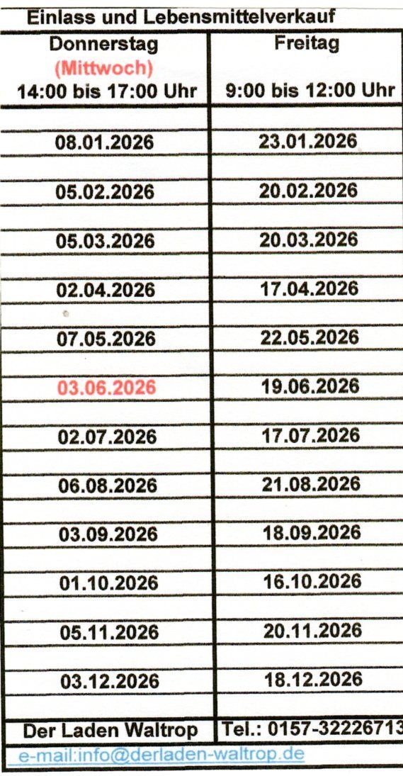 Wir öffnen jeden ersten Donnerstag und jeden dritten Freitag im Monat. Die genauen Daten und Uhrzeiten entnehmen Sie bitte unten stehender Auflistung (Einlass und Lebensmittelverkauf).