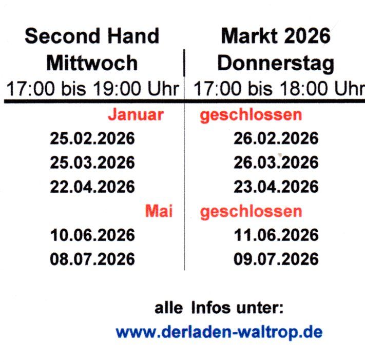 Die Öffnungstermine des Second-Hand Marktes entnehmen Sie bitte unten stehender Auflistung (Second-Hand).